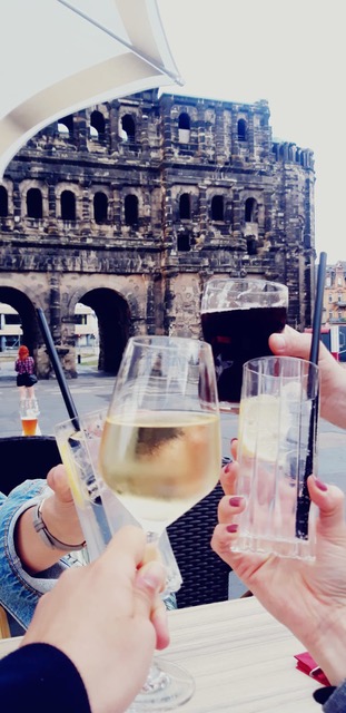 Gegenseitig bieten wir uns Impulse von der App-Empfehlung über aktuelle Youtube-Videos und Kochempfehlungen bis hin zu anspruchsvollen Diskursen, die uns nachdenken, lachen und manchmal still werden lassen — manchmal sogar mehreres davon auf einmal. Wir schwelgen durchaus schon mal in nostalgischen Erinnerungen, aber ohne uns darin zu verlieren und sind — ob beim Quatschen im Auto oder auf dem Mäuerchen mit einem Glas Wein in der Hand — miteinander ganz im Hier und Jetzt. Wir entdecken Dinge für- und miteinander und machen uns auf Dinge aufmerksam, die dem oder der einen oder anderen vielleicht entgangen wären und die wir als Bild, Erinnerung oder auch als rosa Kamevalshut mit nach Hause nehmen. Wir haben unterschiedliche Schrittgeschwindigkeiten und kommen am Ende doch immer wieder zusammen irgendwo an. Ich glaube, wir fordern uns auf unterschiedlichen Ebenen immer wieder gegenseitig heraus, intellektuell, vielleicht auch emotional oder einfach in unserer Unterschiedlichkeit.